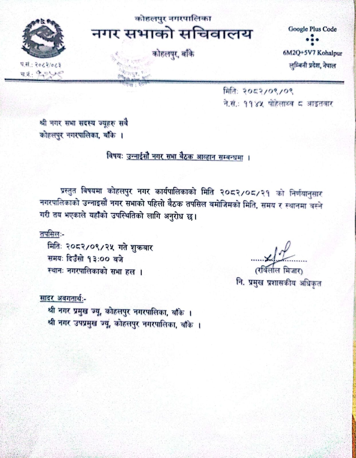 उन्नाईसौ नगर सभा बैठक आह्वान सम्बन्धमा | श्री नगर सभा सदस्यज्यूहरु सबै, को.न.पा. बाँके ।