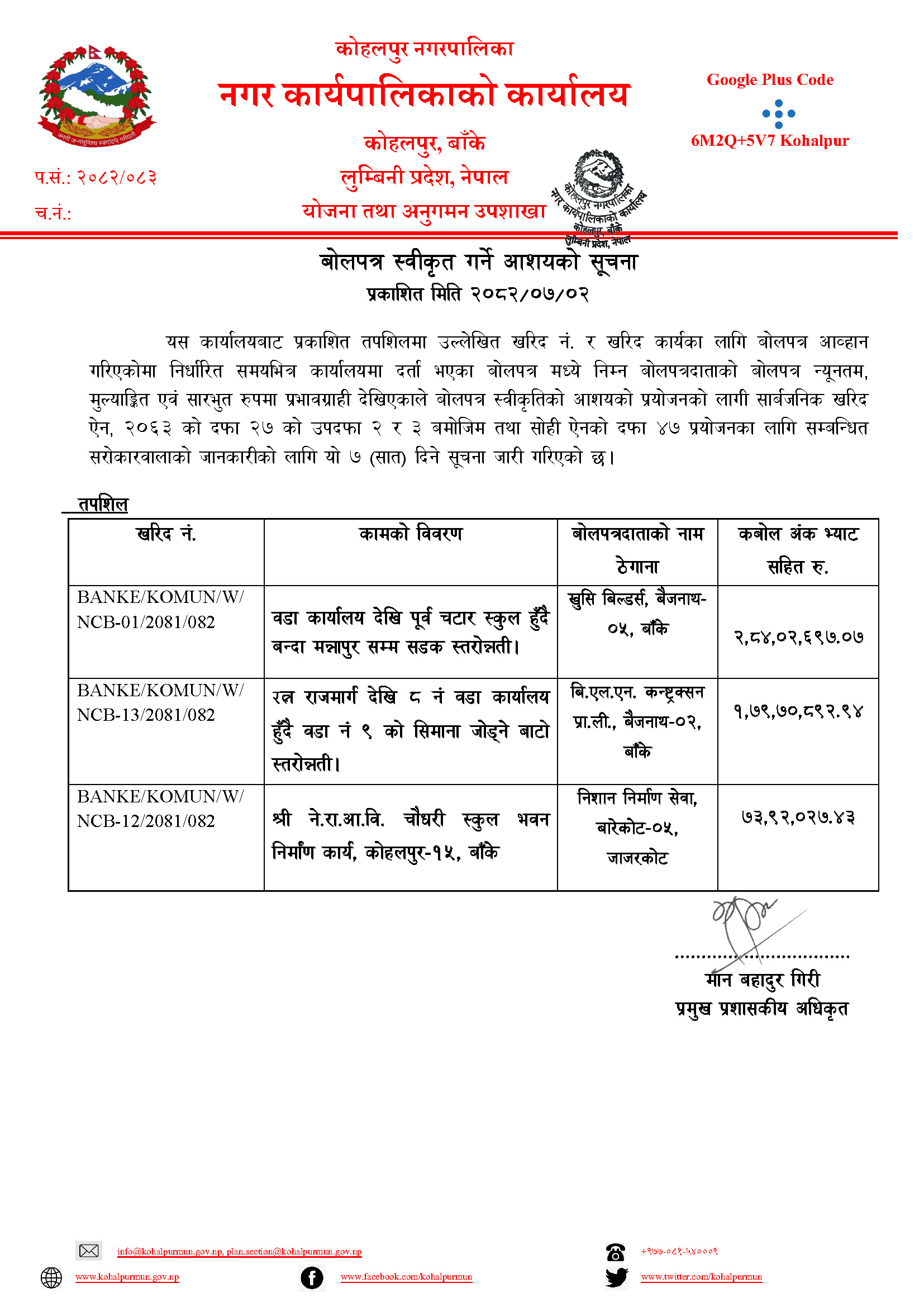 बोलपत्र स्वीकृत गर्ने आशयको सूचना!!! (प्रकाशित २०८२/०७/०२)