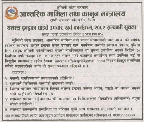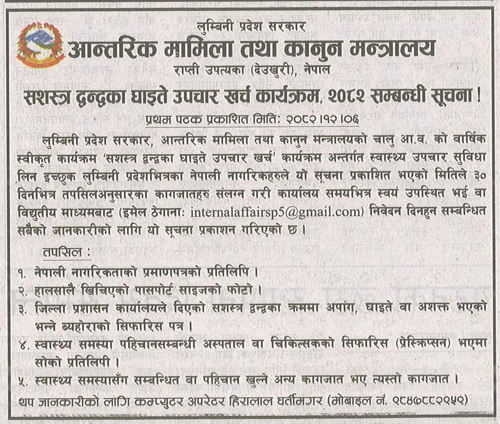 सशस्त्र द्वन्द्वका घाइते उपचार खर्च कार्यक्रम, २०८२ सम्बन्धी ३० दिने सूचना !!! (प्रकाशित २०८२/१२/०६)