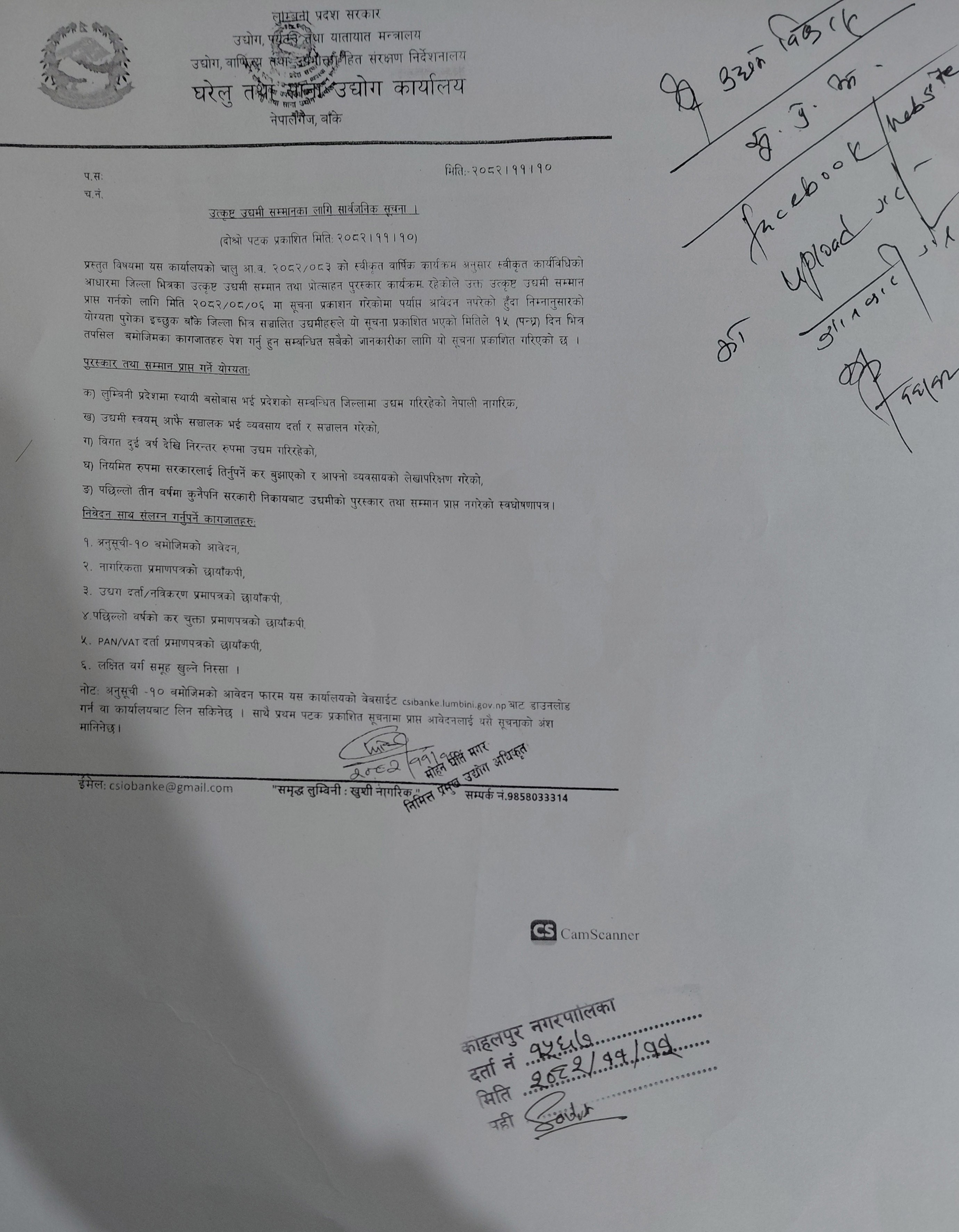 उत्कृष्ट उद्यमी सम्मानका लागी सार्वजनिक सूचना!!! (घरेलु तथा साना उद्योग कार्यालय, बाँके प्रकाशित २०८२/११/१०)