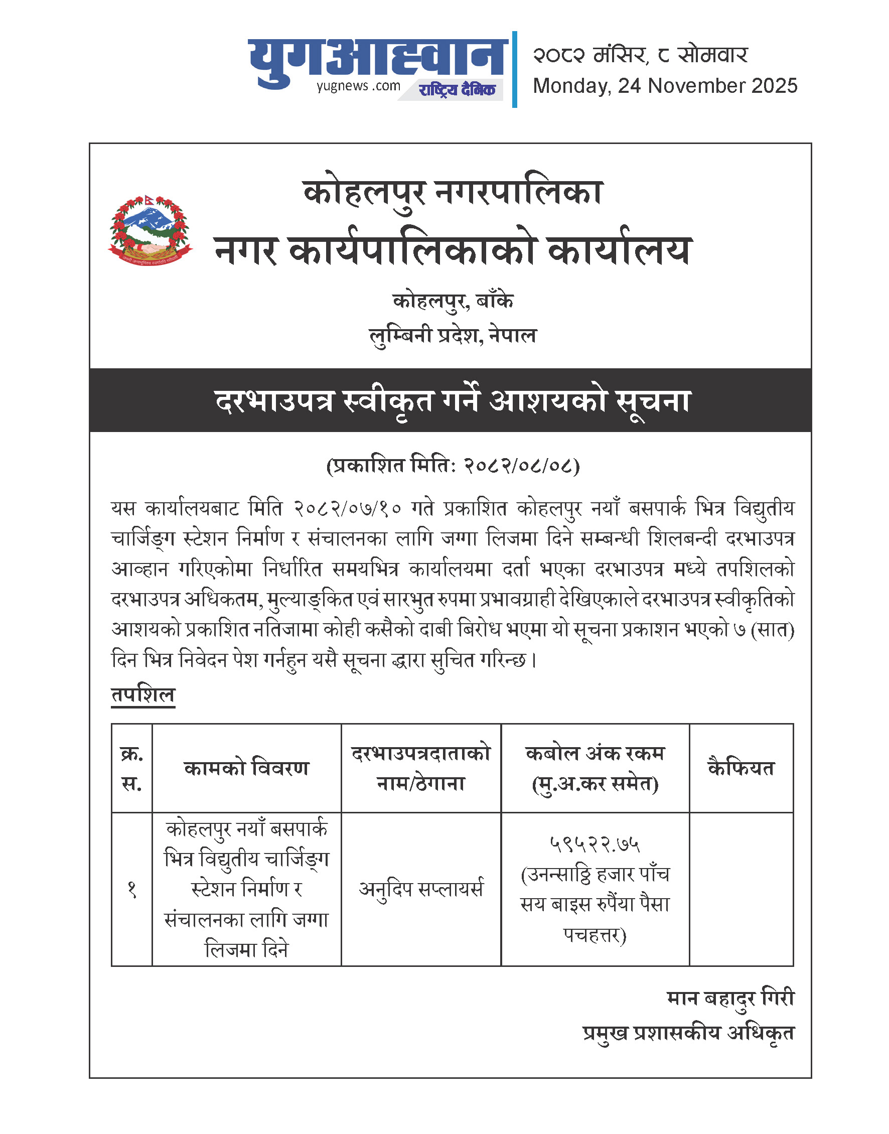 दरभाउपत्र स्वीकृत गर्ने आशयको सूचना!!!(प्रकाशित २०८२/०८/०८)