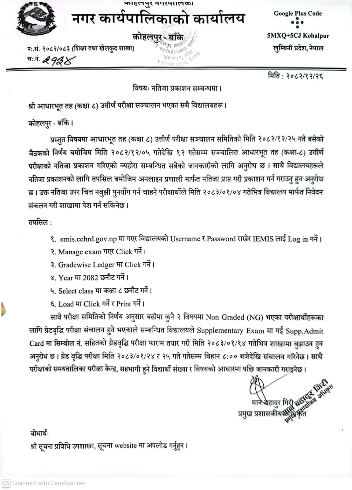BLE परीक्षाको नतिजा प्रकाशन सम्बन्धमा। श्री आधारभूत तह (कक्षा ८) उत्तीर्ण परीक्षा सञ्चालन भएका सबै विद्यालयहरू।