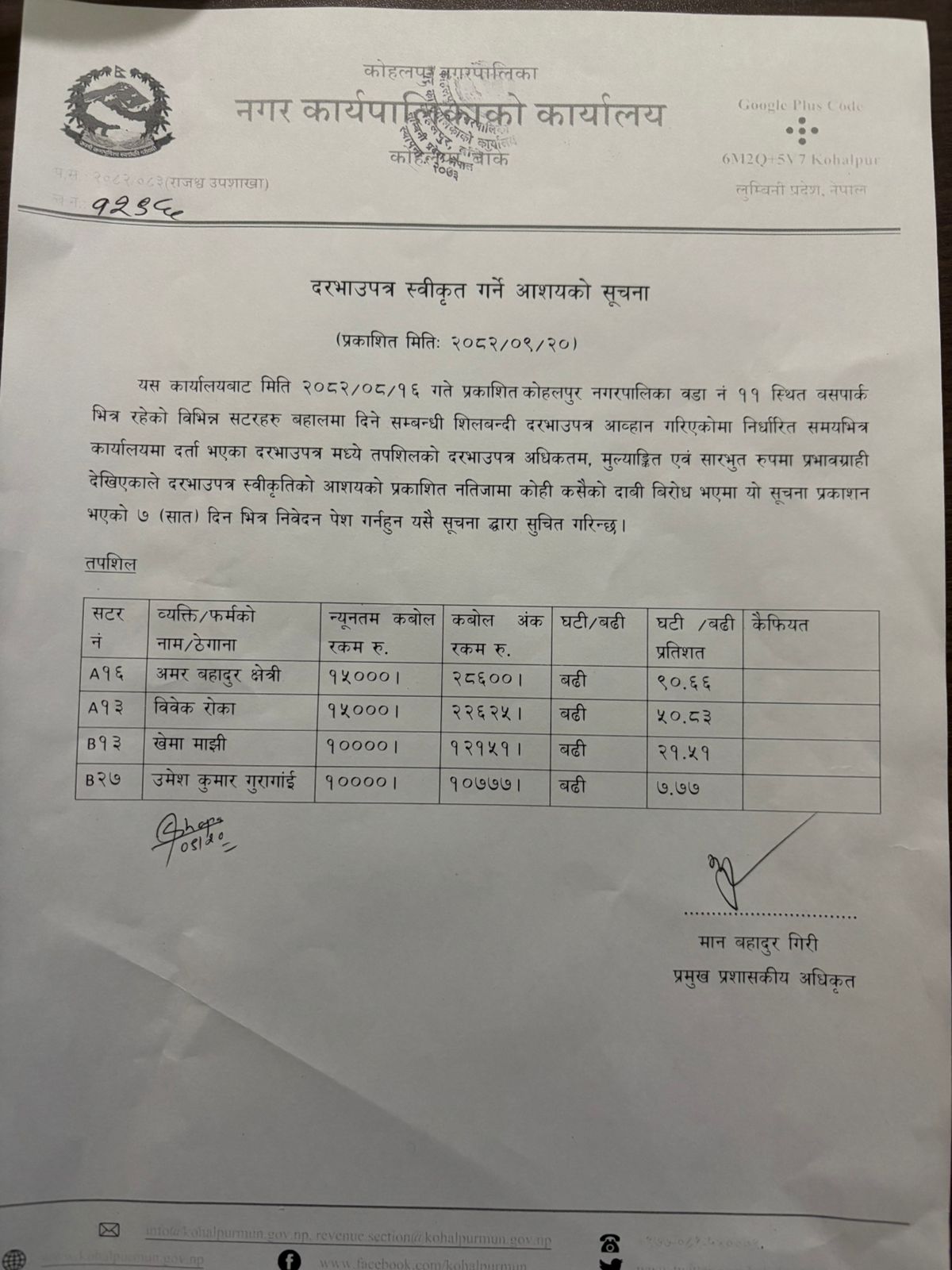 दरभाउ पत्र (नयाँ बसपार्क सटर) स्वीकृत गर्ने आशयको सूचना!!! (प्रकाशित २०८२/०९/२०)