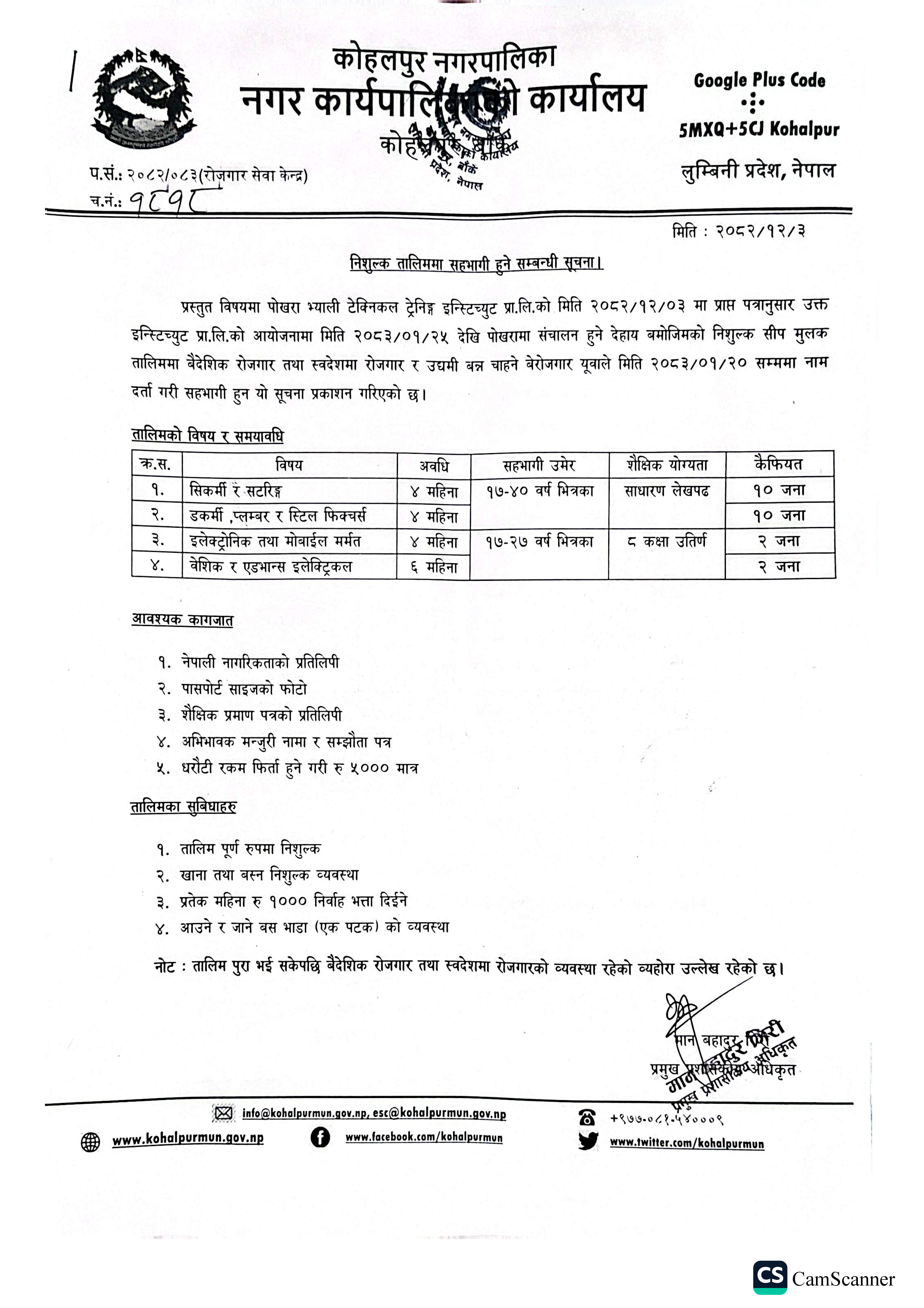 निशुल्क सिपमुलक तालिममा सहभागी हुने सम्बन्धी १७ दिने सूचना!!! (प्रकाशित २०८२/१२/०३)