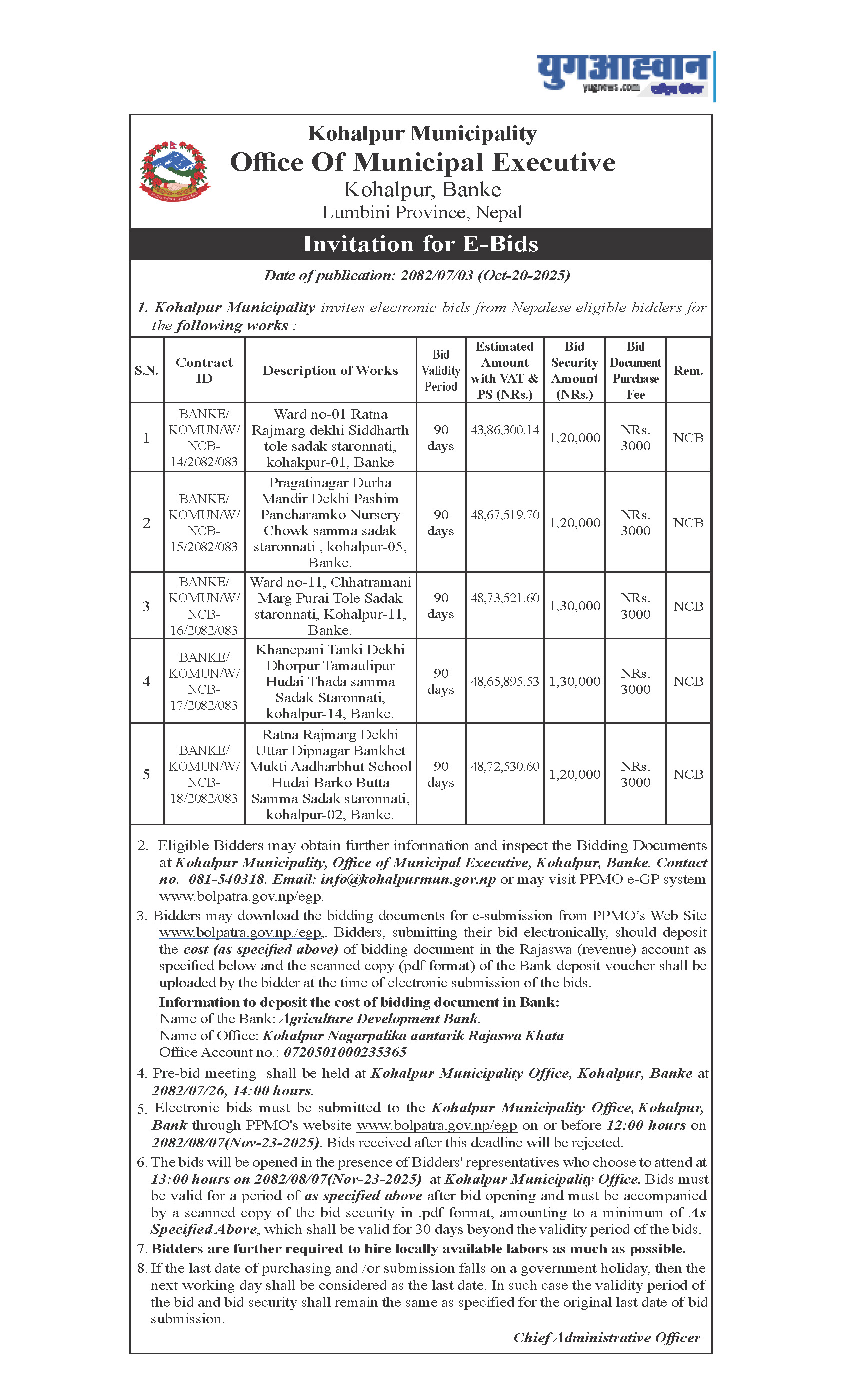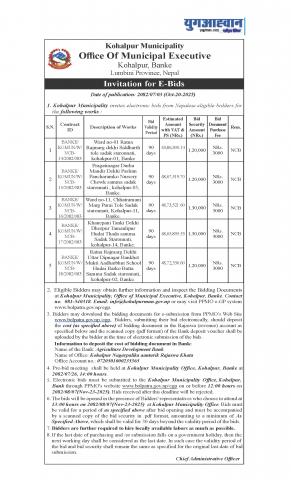 विभिन्न वडाको सडक स्तरउन्नति कार्यको लागि बोलपत्र आह्वान सम्बन्धी ३० दिने सूचना!!! (प्रकाशित २०८२/०७/०३)