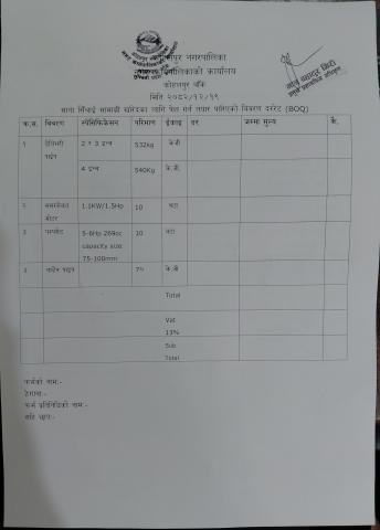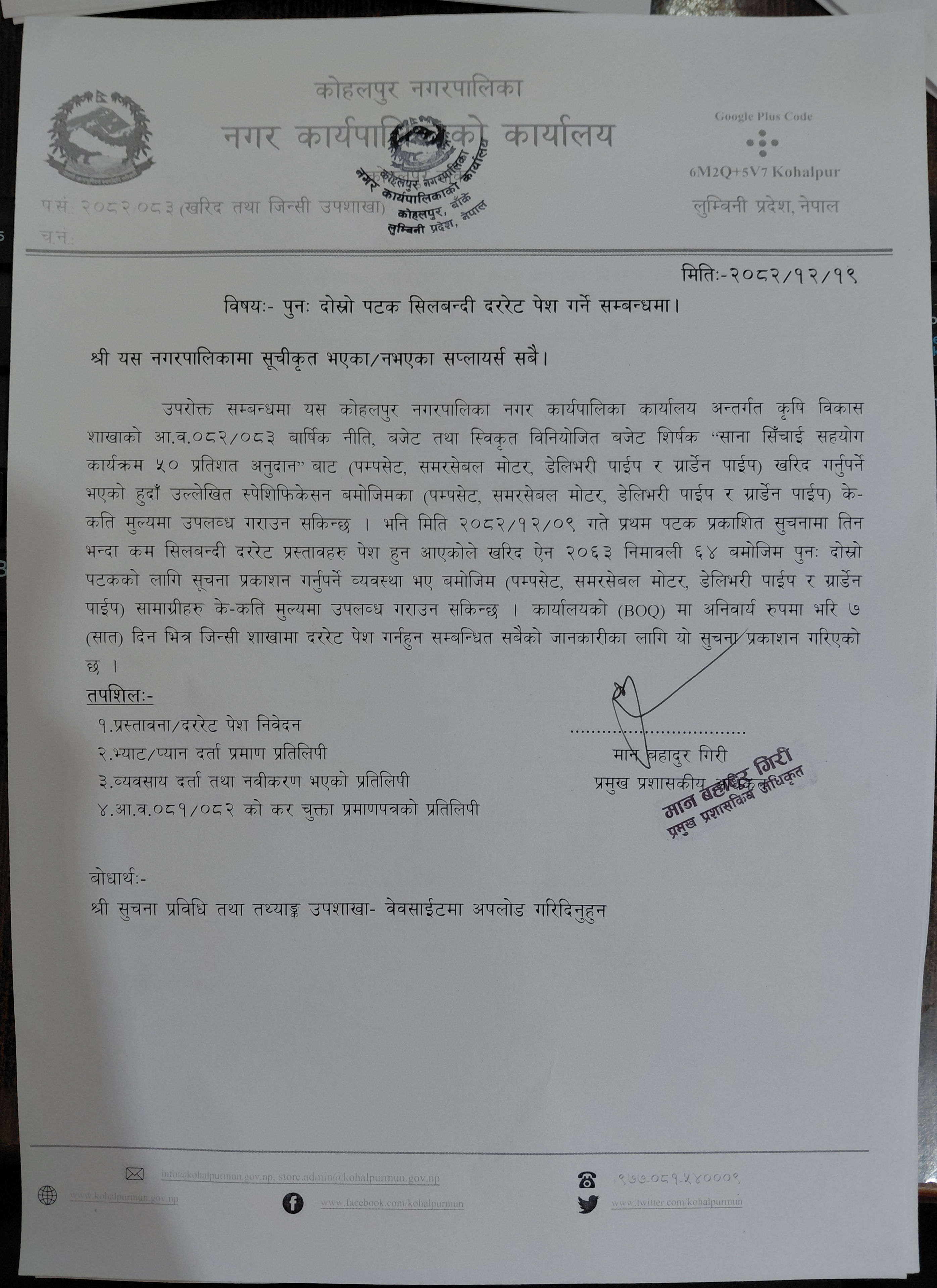 सिचाई सामग्रीको सिलबन्दी दररेट पेश गर्ने सम्बन्धी ७ दिने सूचना!!! (दोश्रो पटक प्रकाशित २०८२/१२/१९)