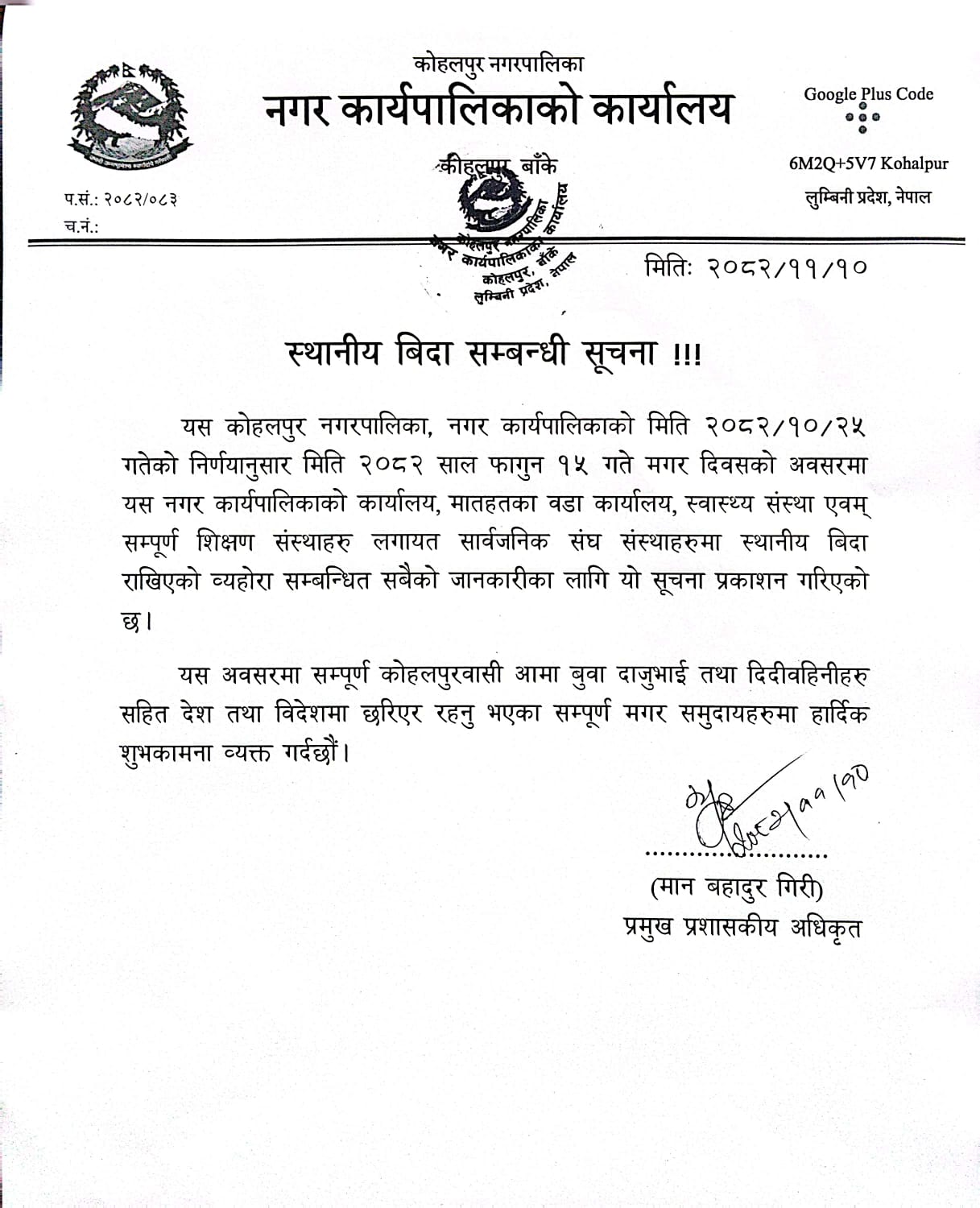 स्थानीय विदा सम्बन्धी सूचना!!! (प्रकाशित २०८२/११/१०)