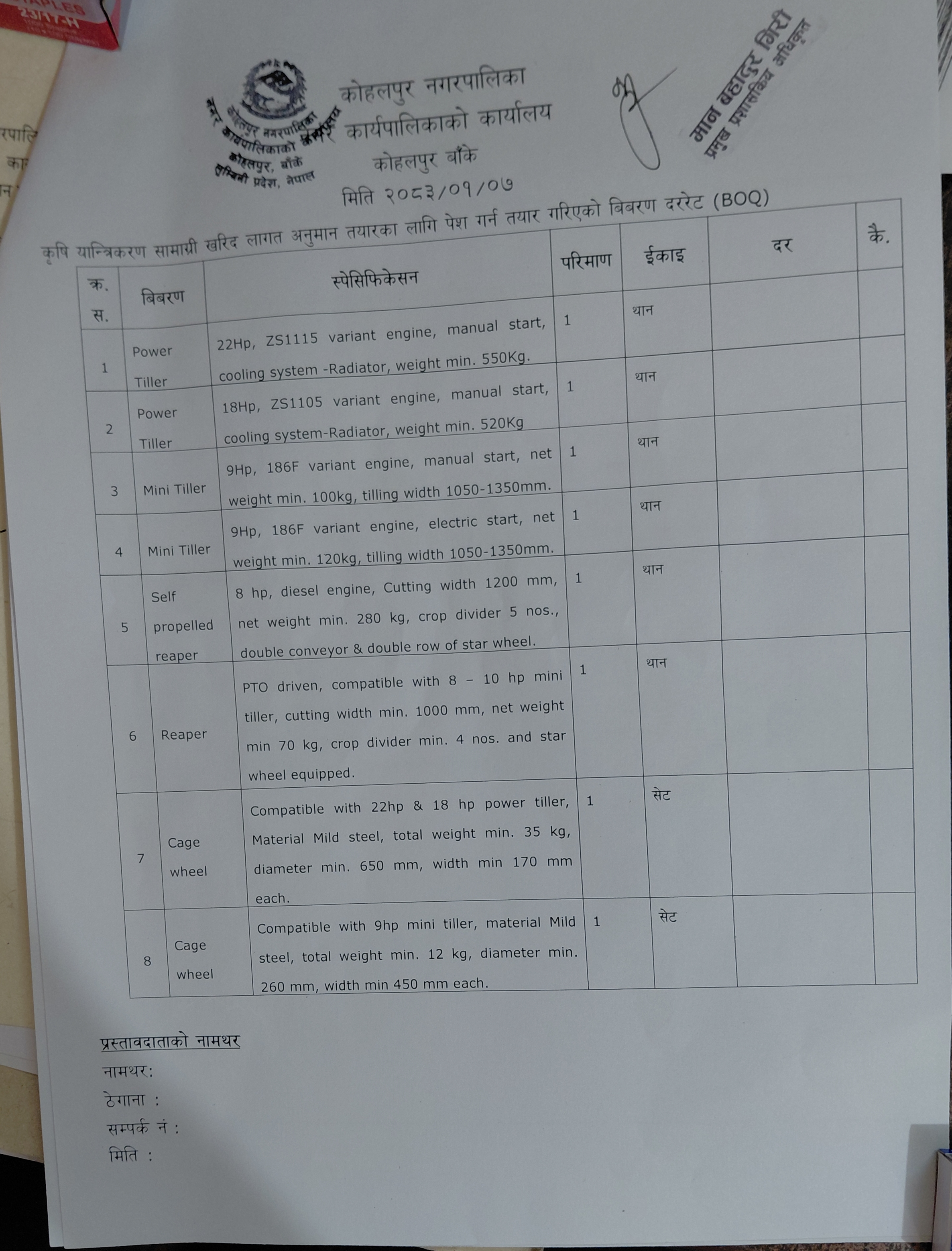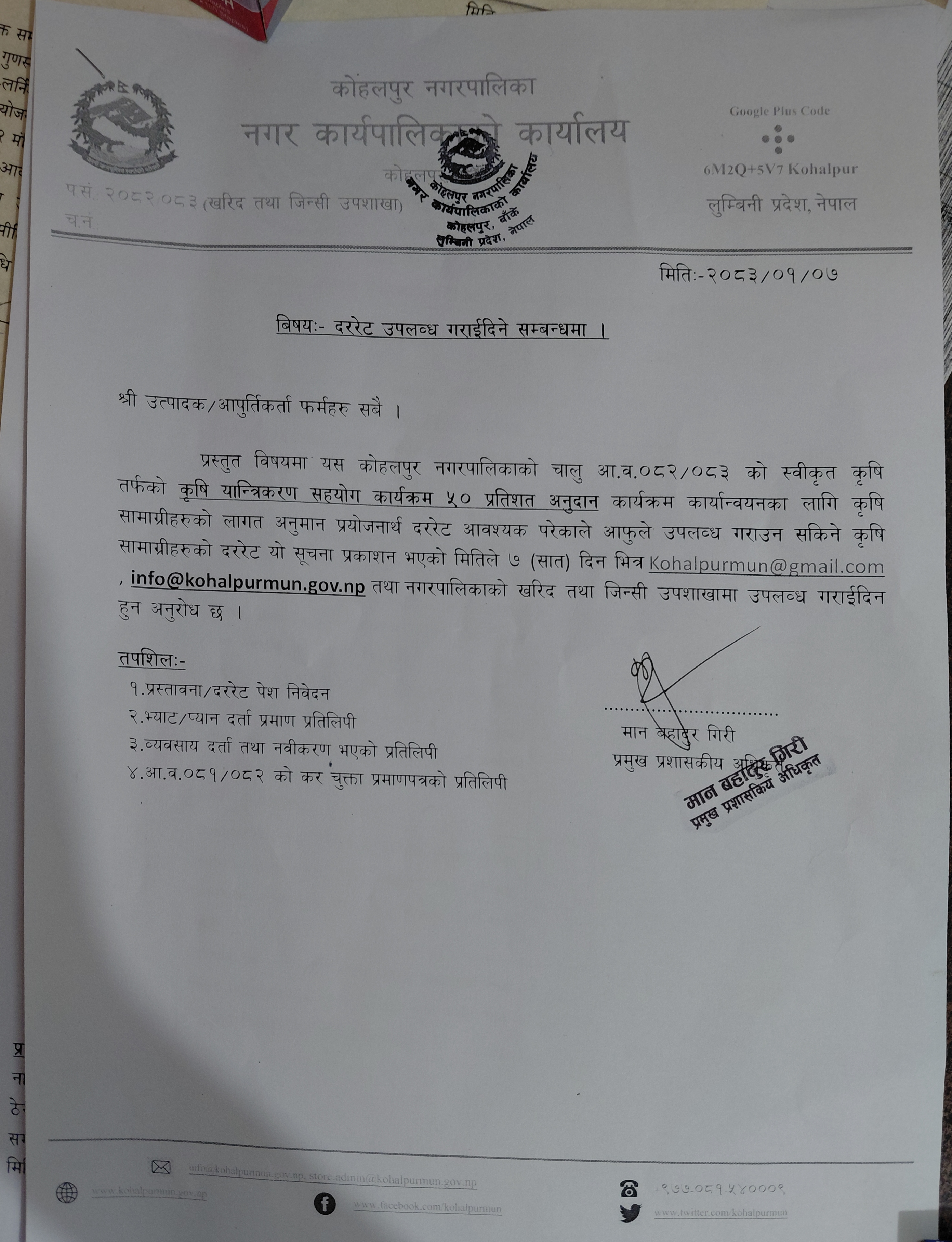 » दररेट उपलब्ध गराइदिने सम्बन्धमा | श्री उत्पादक/ आपुर्तिकर्ता फर्महरु सबै। (मिति २०८३/०१/०७)