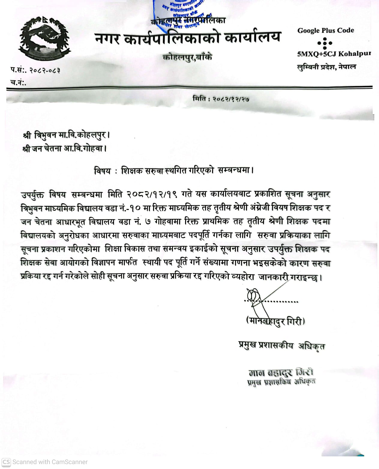 शिक्षक सरुवा स्थगित गरिएको सम्बन्धमा । श्री त्रिभुवन मा.वि. , जनचेतना आ.वि. गोहावा